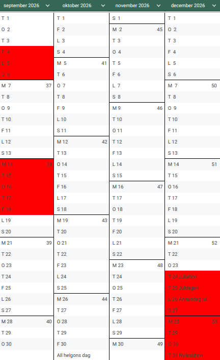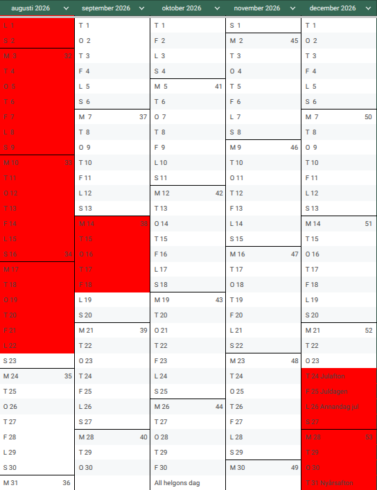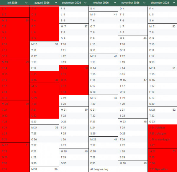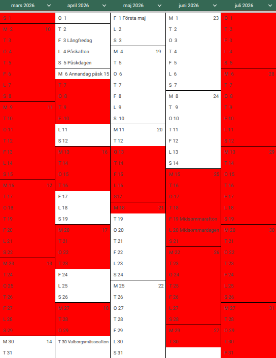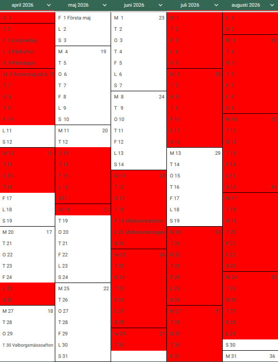 Rödmarkerade dagar är bokade.