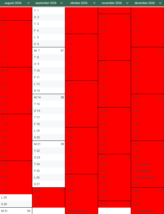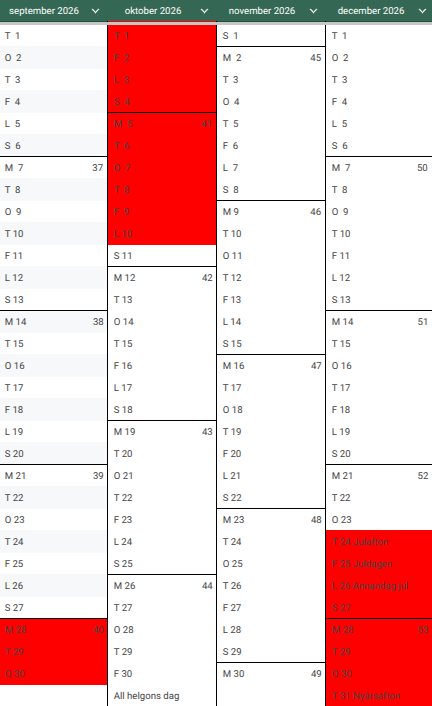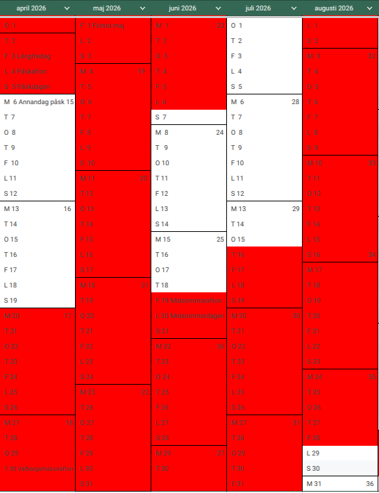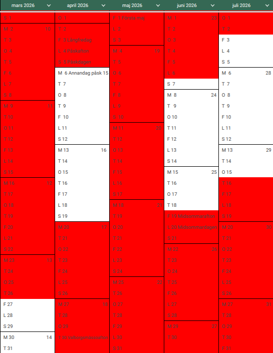 Rödmarkerade dagar är bokade.